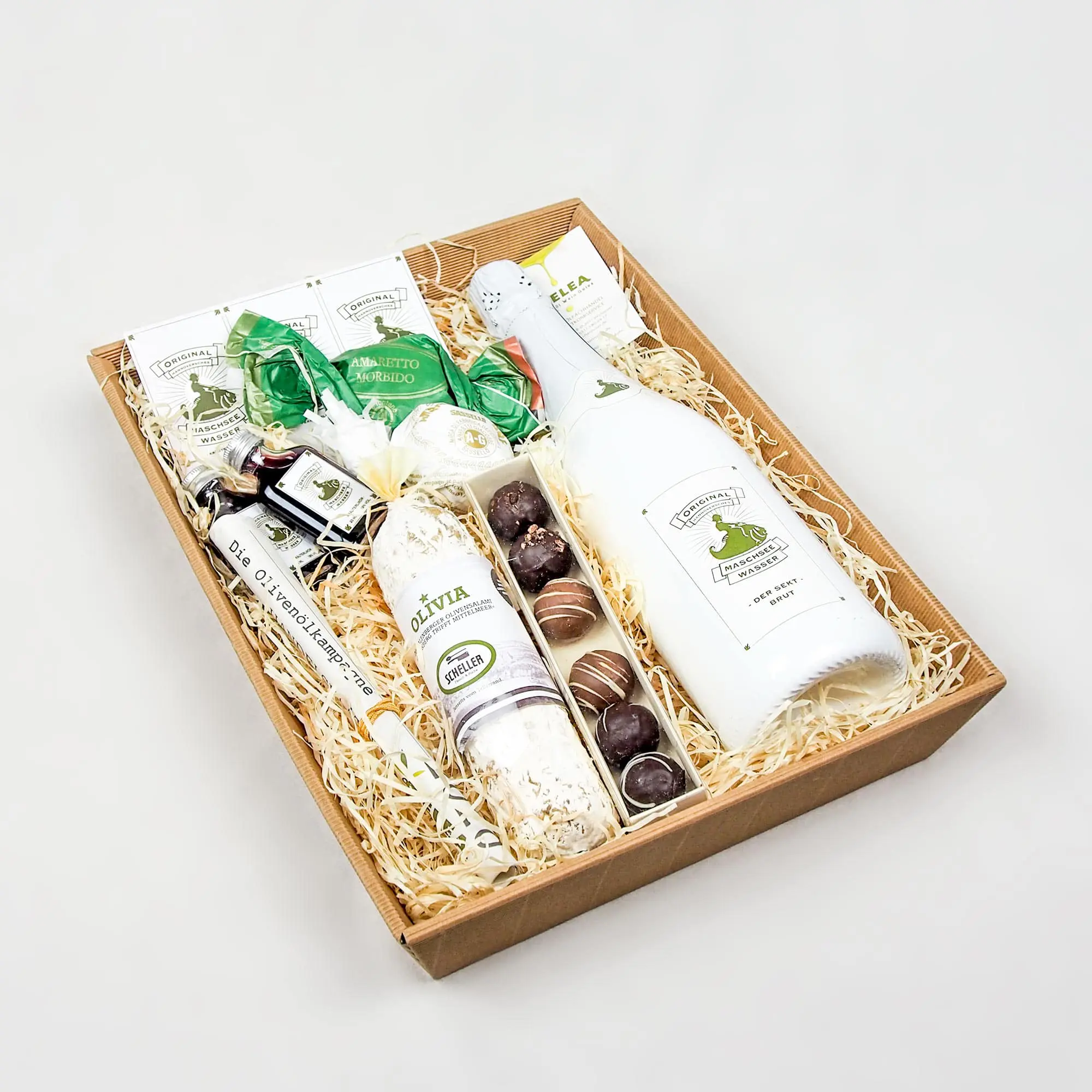 - 6 handgeschöpften Maschseewasser-Schokopralinen (Die Maschseewasser-Schokopralinen leider nicht immer lieferbar und werden bei Bedarf durch hochwertige Pralinés ersetzt.)