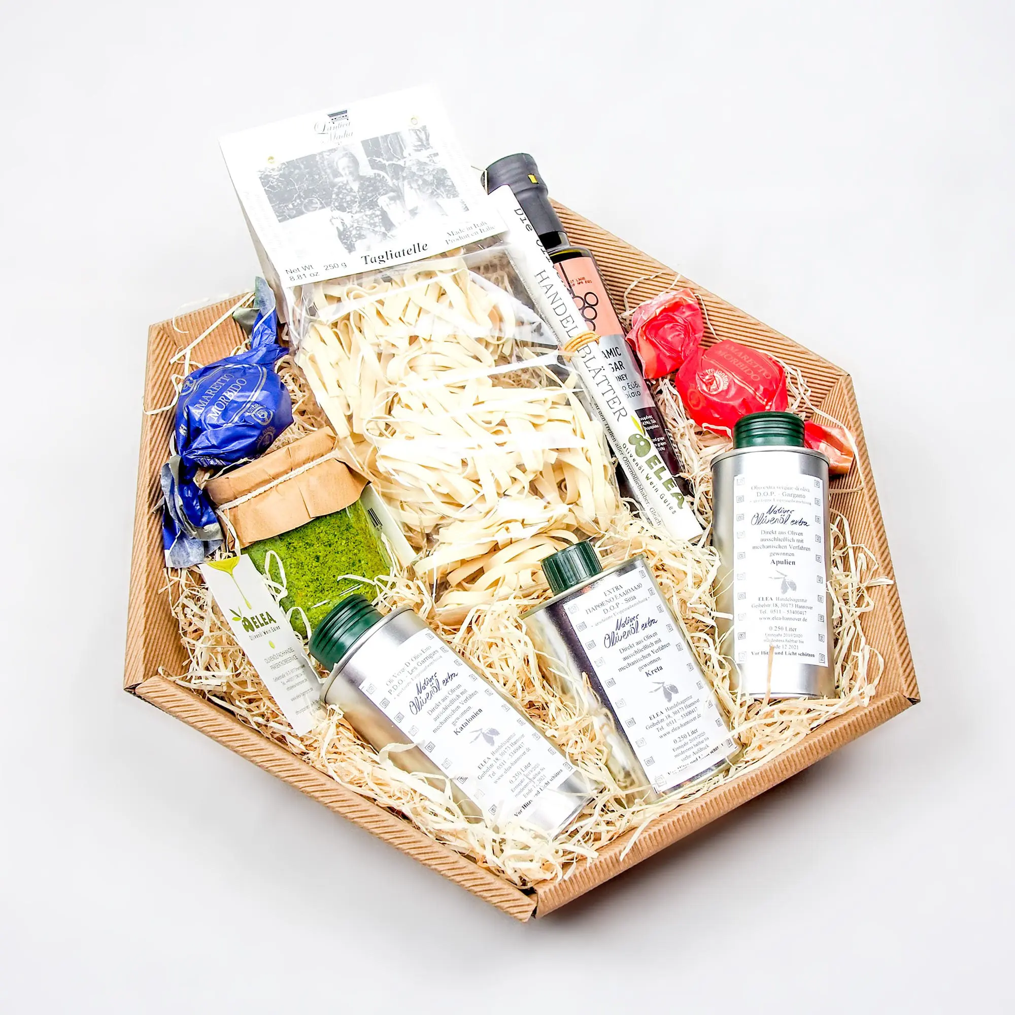Präsentkorb Olivenölprobe und mehr, mit drei verschiedenen Olivenölen nativ extra, Feigenbalsamico aus Griechenland, Pesto alla Genovese und Tagliatelle. Genuss zum Verschenken!